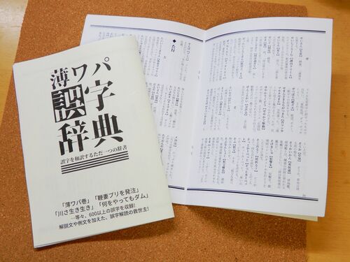 先日から作業を進めておりました「薄ワパ誤字辞典」の製本作業が終わりました。コンビニコピー機利用の自家製本です。軽い気持ちでコンビニコピー機の前へ行き、印刷枚数を確認して茫然としてしまいました。 本文用紙7枚を20部ほど刷るつもりだったので当然…
